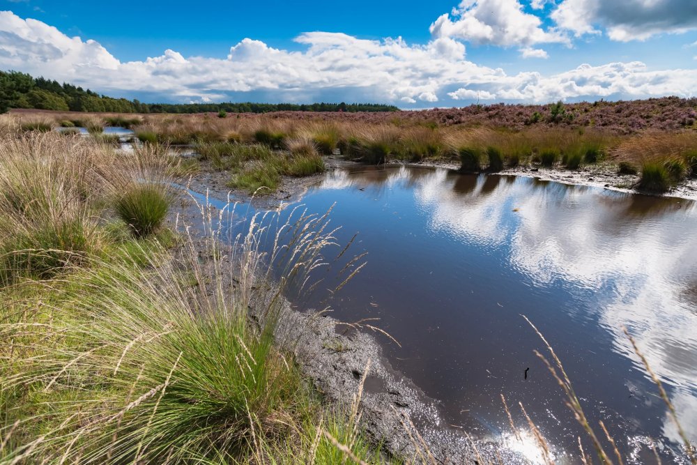 Surrounded by shrubs.